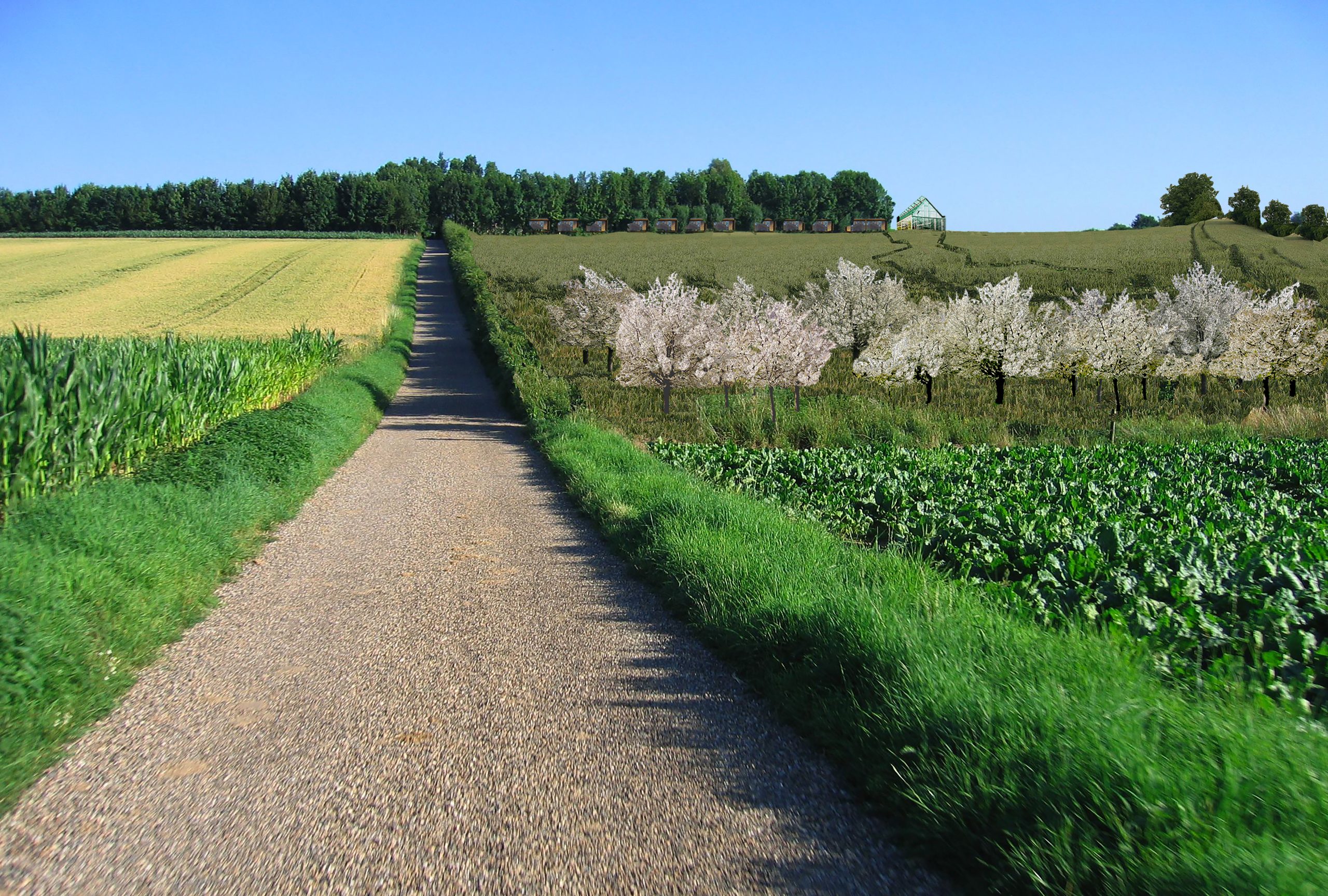 Heuvelland, the field with fruit trees, crops and hiking trails towards the eco-zone, and the lodges overlooking the field