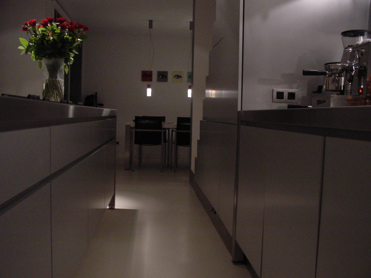 On the ground floor and the first floor all spaces are connected in an open way to become a loft. On ground floor the bedroom block is transformed into a dining room and kitchen connected to the living. A unit with stairs, kitchen, cupboards and storage structures the space. Upstairs the rooms around the central void have been transformed into an open space with bed, bath and wardrobe.